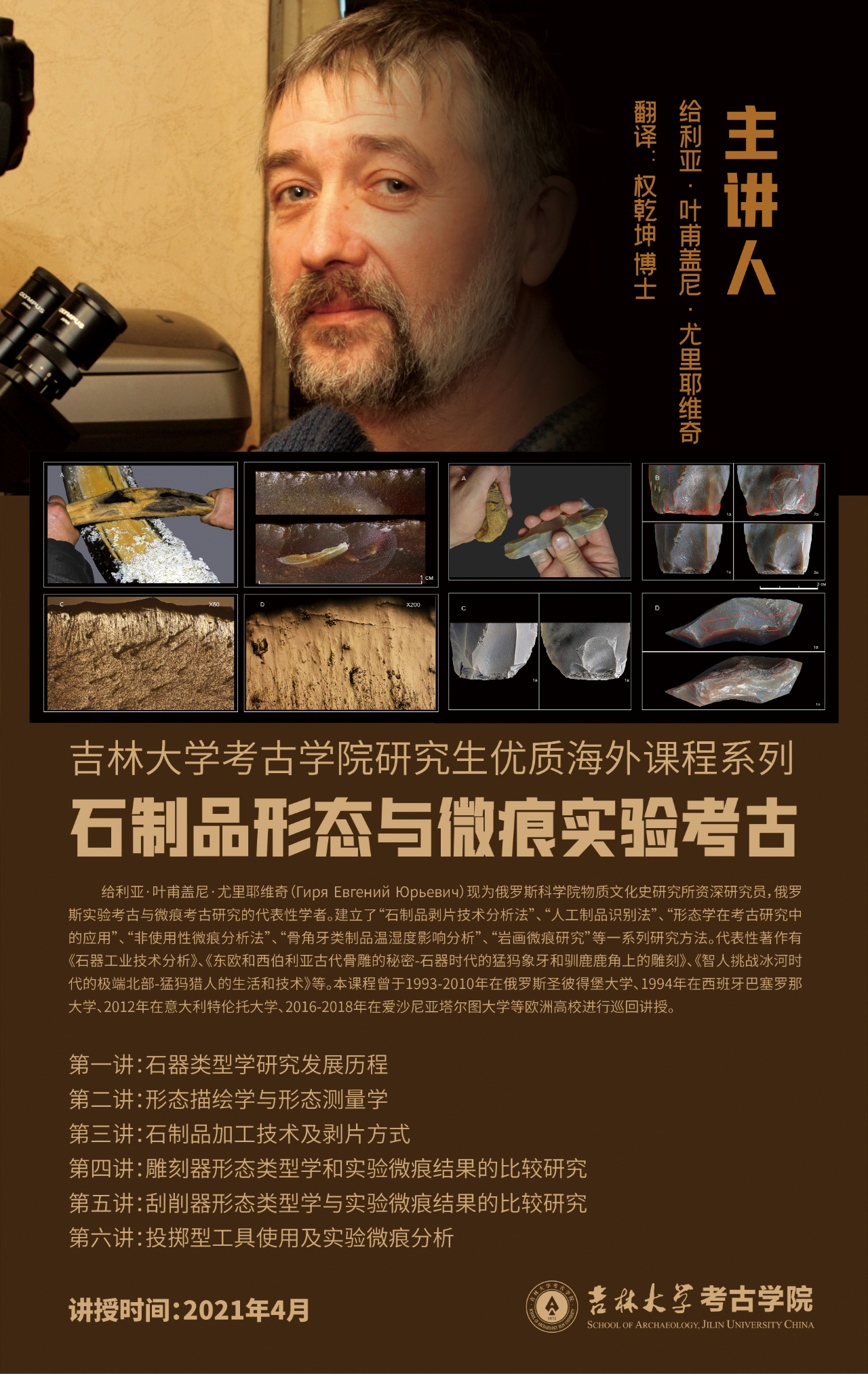About him: Giria Evgenii is a senior researcher in Institute of the History of Material Culture of the Russian Academy of Sciences, who initiated a series of research method including "analysis method to peeling technique of lithic tools", "method to identify artificial tools", "Application of morphological concepts in archaeological research", "Non-use micro-mark analysis method", "analysis to the influence of temperature and humidity on bone-horn-tooth products" and "Study on Micro-marks in Rock Paintings".Representative works include "Technical Analysis of Lithic Tool Industry","Secrets of ancient bone carvings in Eastern Europe and Siberia-carvings on mammoth ivory and reindeer antlers from the Stone Age","Homo sapiens challenges the extreme north of the ice age-the life and technology of mammoth hunters" and so on.