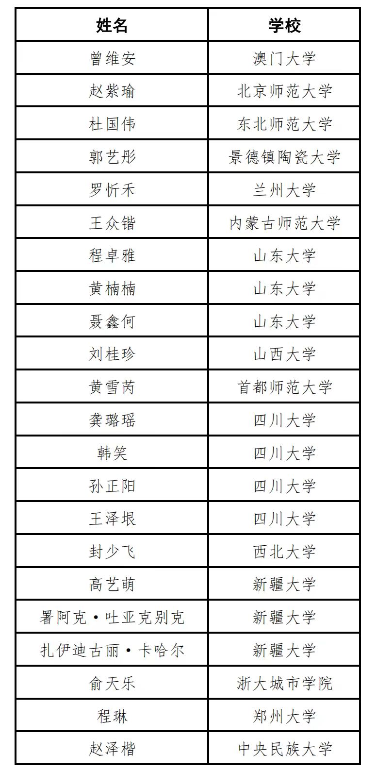 注:该名单以高校名称首字母排序。
