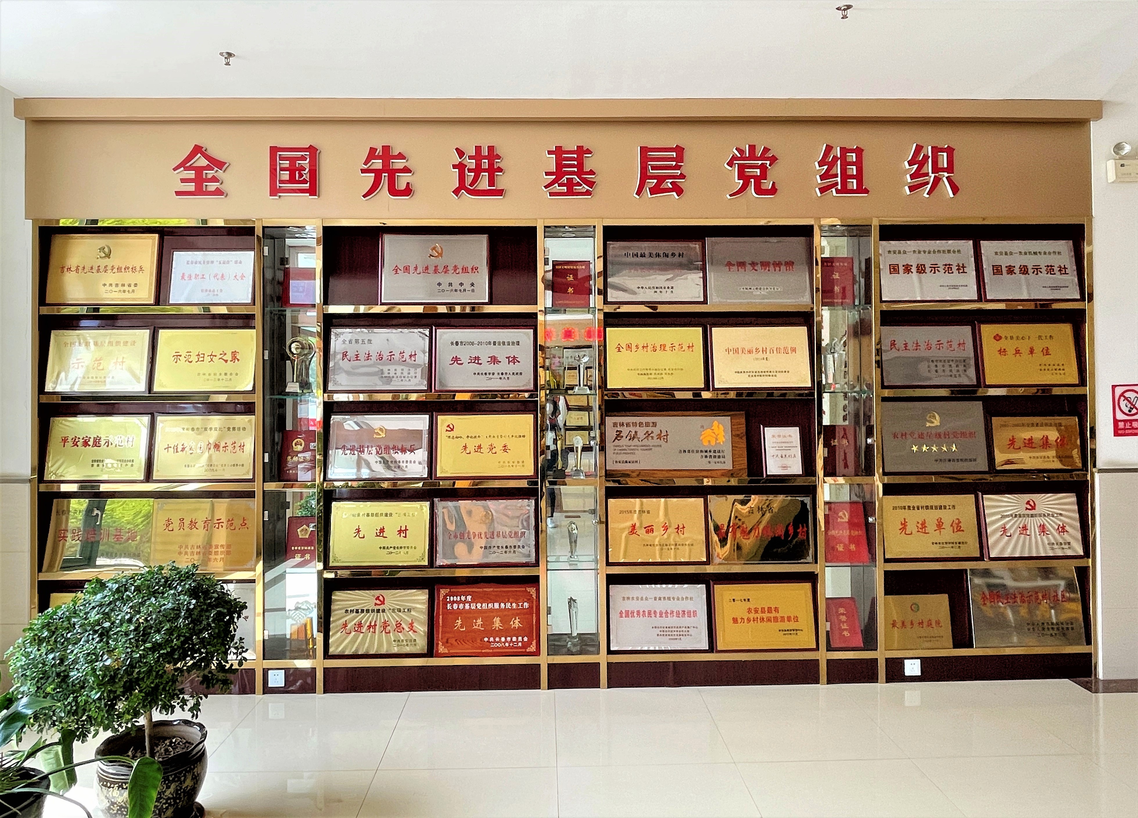 嘉和社区服务管理中心、也就是传统概念里的村委会,坐落在社区大门的正北方。一站式服务大厅办公面积1600平方米,内设农家书屋、卫生室、银行、餐厅、会议室、调解室以及便民服务台等,是陈家店村主要的办公议事中心和村民集体活动中心。一楼左手有一间党员学习室,桌面上摆满了学习用书和笔记。由于白天工作繁忙,每周五晚上党员们就在这里进行集中学习研讨。学习室再往里走的卫生室里有一名村民在输液。右手的餐厅工作人员在准备午餐。林立的荣誉牌匾排放在服务管理中心大门两侧,静静地映射着近午的阳光。