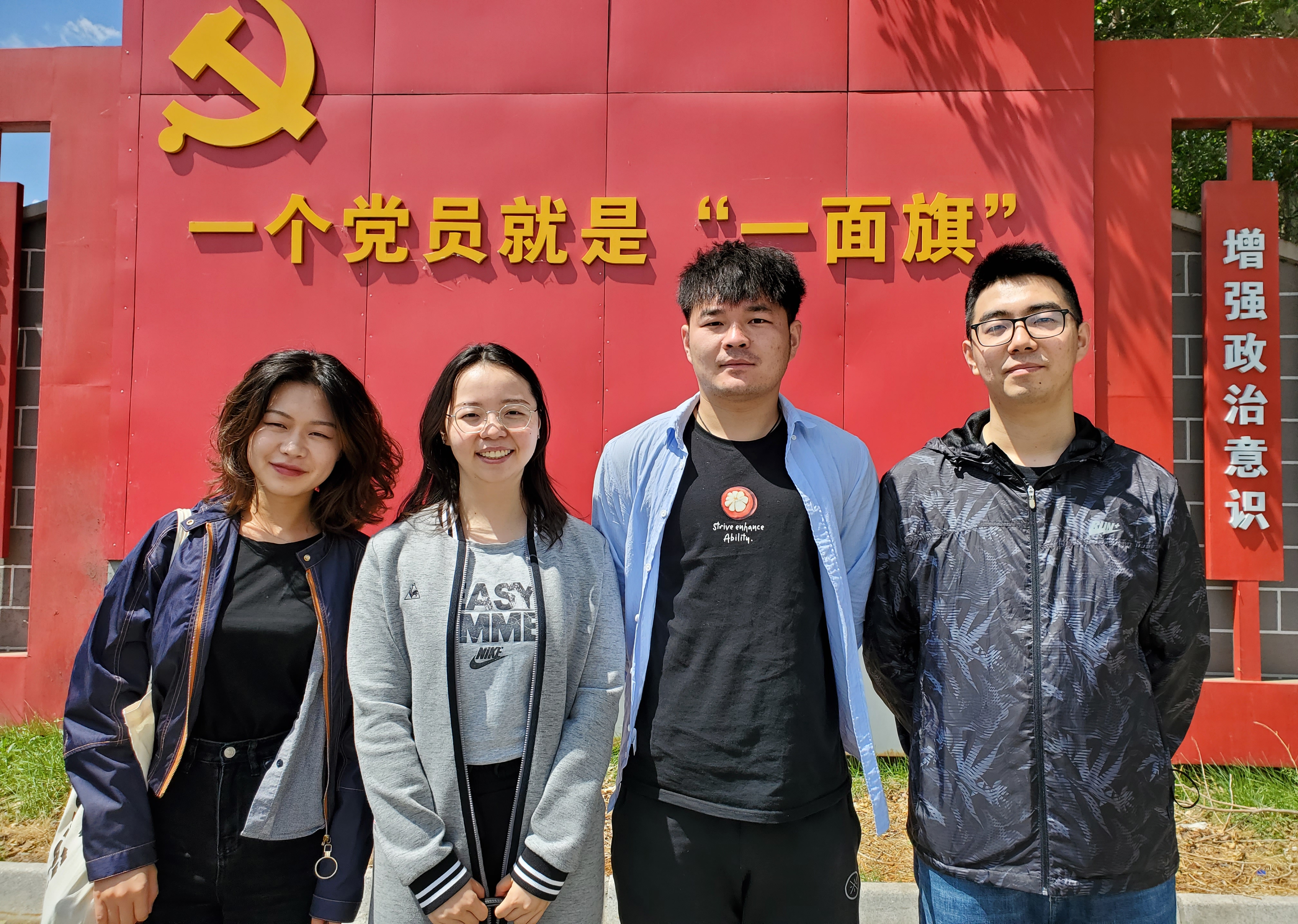 “一个党员就是‘一面旗’”。师生们在拍照留念的同时,树起了心中的那面红旗。