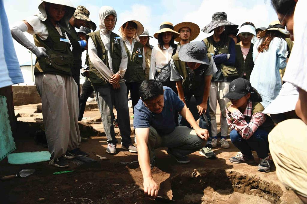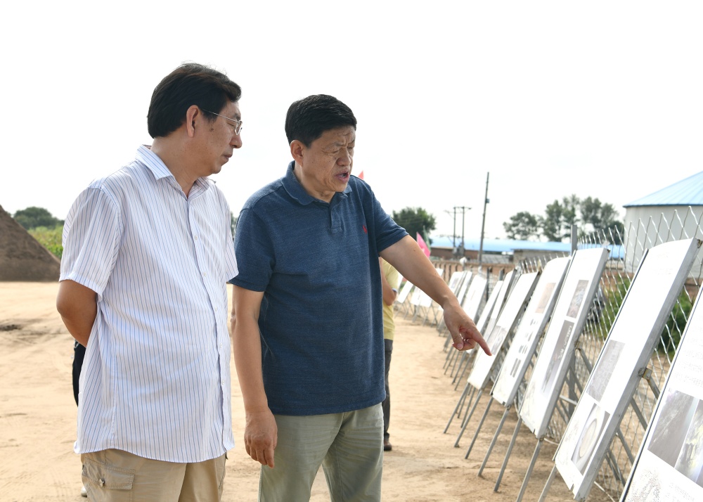 学院党政人员一行首先来到考古发掘现场,在领队方启老师和陈醉老师的带领下,先后检查了公众考古宣传展示区、监控室、装备室、保护棚、发掘区、系统采样浮选区、参观群众问卷调查区、文创产品展陈区等。在几个有代表性的探方中,领队老师和学生向赵院长汇报了挖掘进度、挖掘思考与感悟。赵宾福针对现场情况,向同学们提出问题,进行细致的现场业务指导,并与师生们分享自己的田野经验。