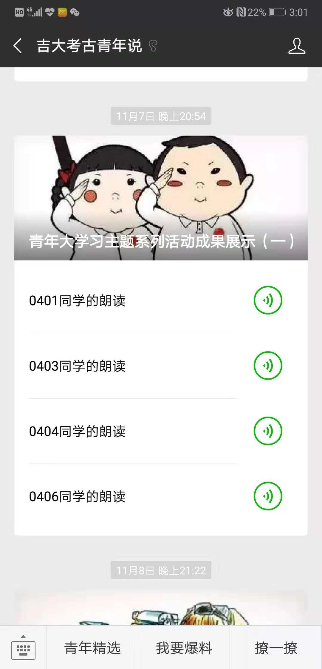 首先,本次推送中吉大考古青年说微信平台首先展示了霍奕然等四名同学的经典朗读音频。其中,我们聆听了a片欧美