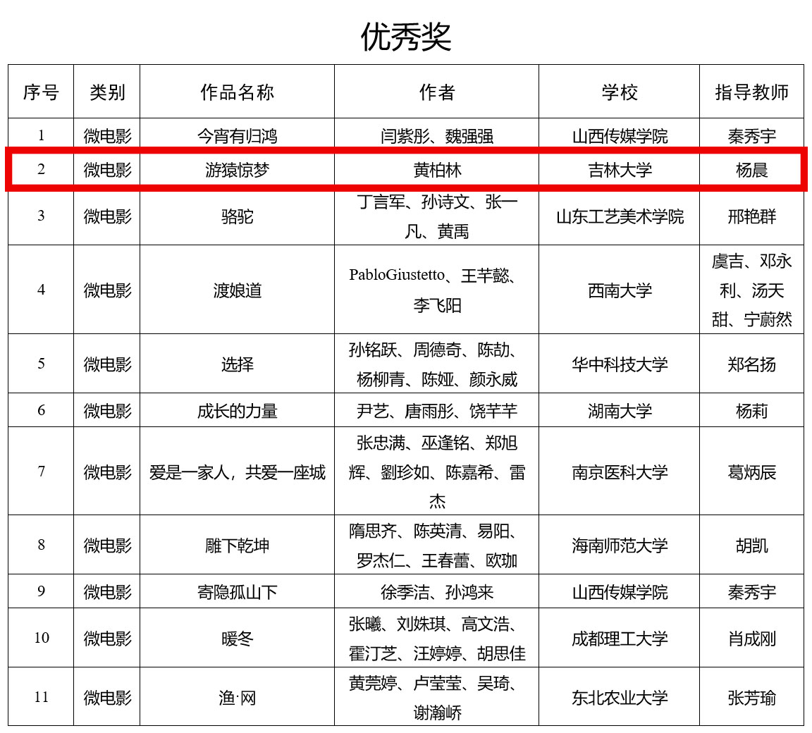 “游猿惊梦”微电影作品在第五届“全国大学生网络文化节”中获得微电影类优秀奖。