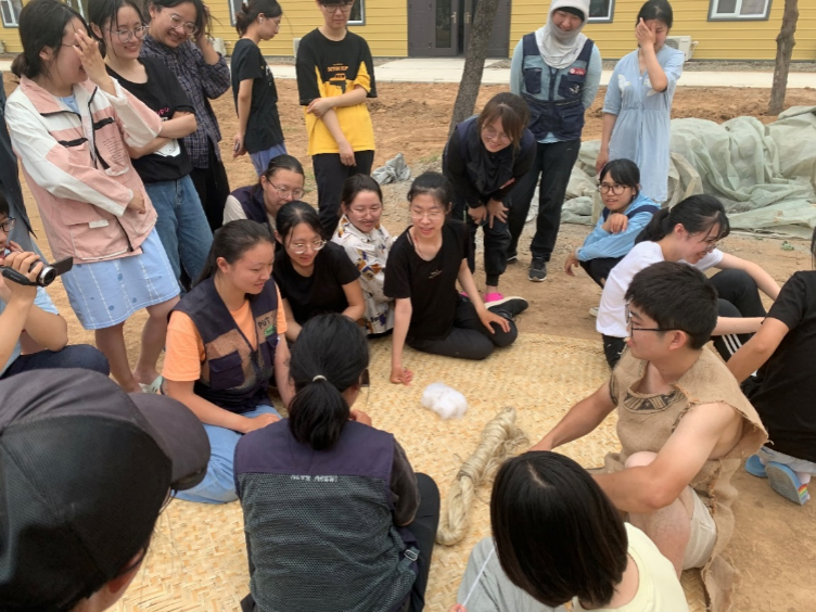 赵里萌老师(穿麻布衣服者)在田野考古实践教学基地为同学们模拟古人使用陶纺轮的场景