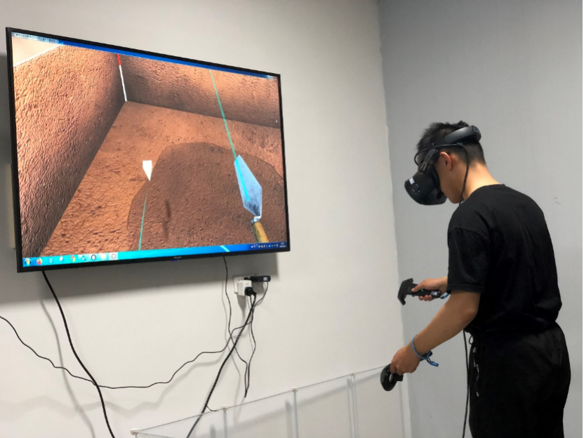 田玉峰同学佩戴VR设备通过虚拟仿真实验课程进行田野考古发掘学习