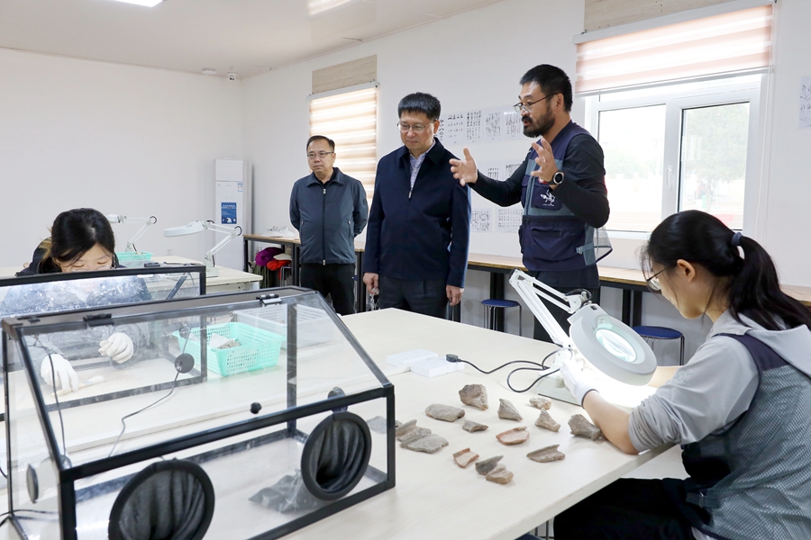 在考古工作站,张希进一步考察了师生日常工作情况,走进田野考古现场教室、文物医院、资料室、装备室等处,了解文物整理和登记规程,检看同学们的考古工作记录,对学院传承科学精神和优良学风,以及同学们的严谨细致和训练有素表示赞许和肯定。