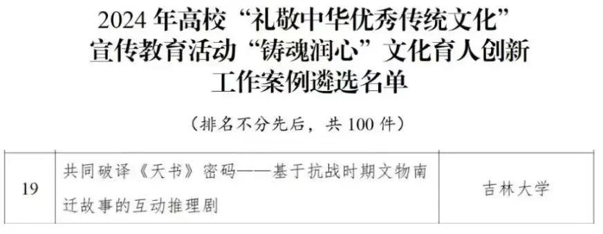 在2024年“礼敬中华优秀传统文化”宣传教育活动中,“共同破译《天书》密码——基于抗战时期文物南迁故事的互动推理剧”项目成功入选教育部思政司“礼敬中华优秀传统文化”宣传教育活动文化育人创新工作案例,该项目以抗日战争期间文物南迁的真实历史为背景,通过沉浸式推理剧情设计,将中华文脉的传承融入实践教育,打造了兼具思想性与趣味性的思政课堂。