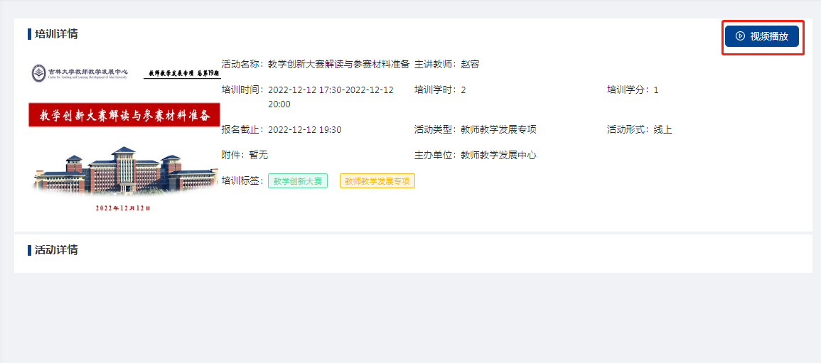 回放须在校园网或VPN网络环境下,登录教师教学发展数据与业务管理系统(//jfywxt.mfomap.com),依次点击“XX培训”→“视频播放”,观看视频。