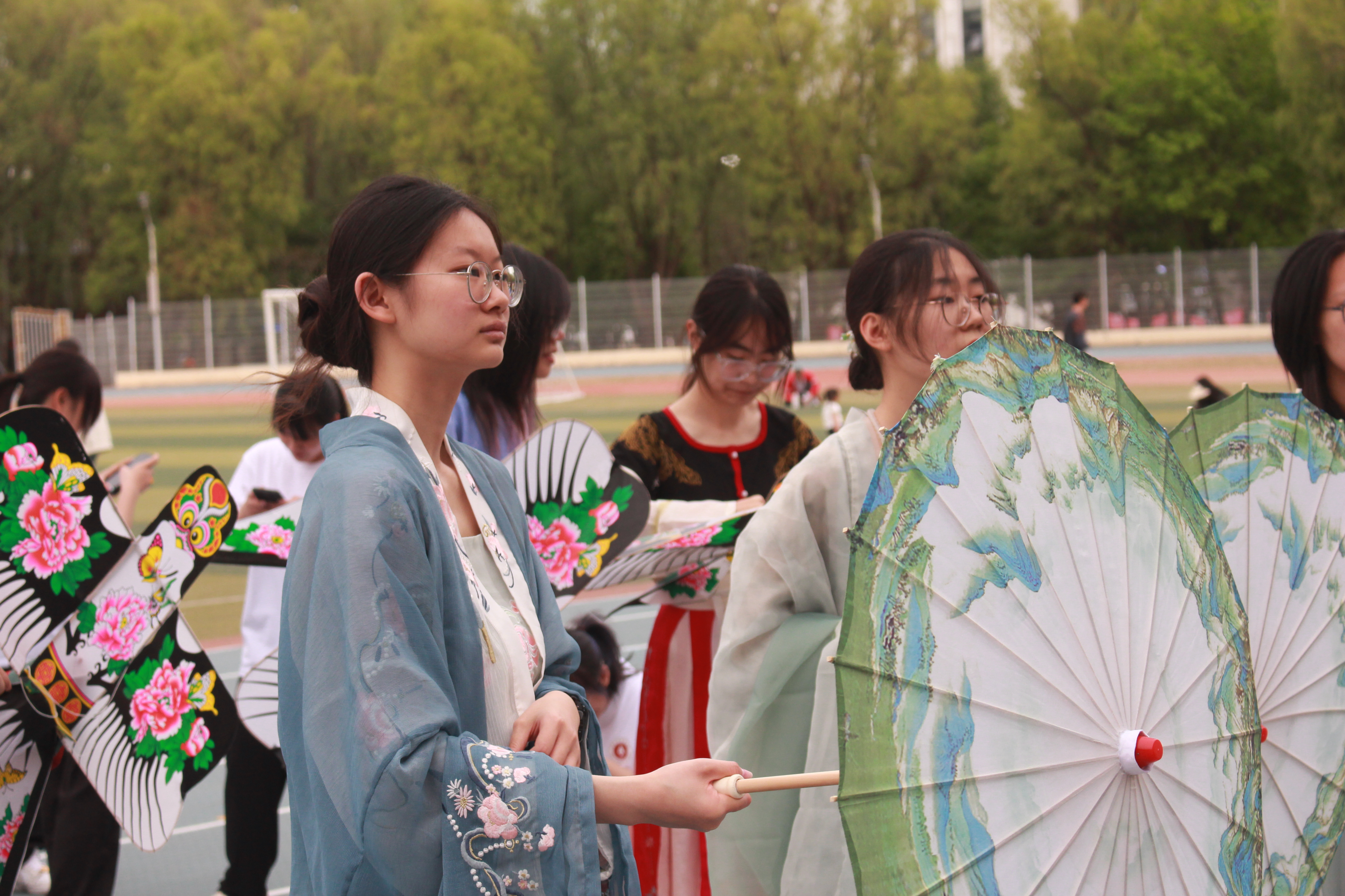 身着汉服的同学不断调整纸伞与纸鸢的展示方式,以期呈现更好的视觉效果。模拟发掘的同学精益求精,修改动作错误,展现考古学人求实求真的严谨态度。