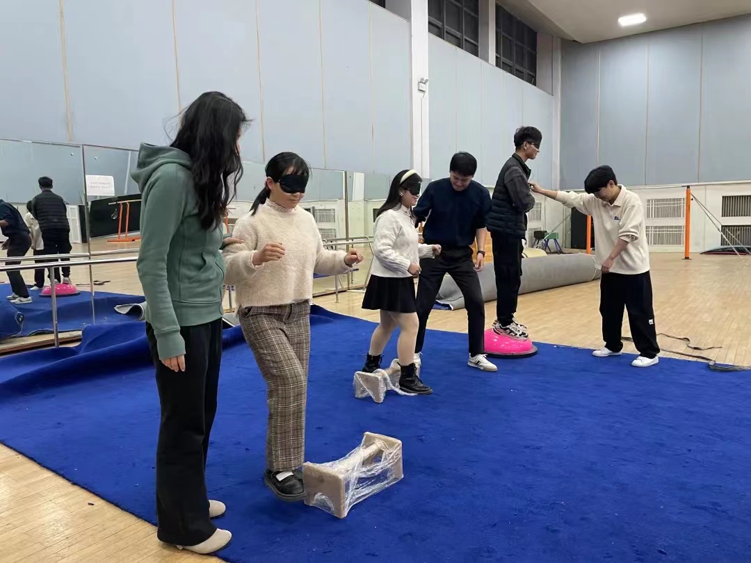 在第三项游戏中,首先,同学们选出三位同学担任“盲人”、三位同学担任“引导者”。其次,“盲人”由“引导者”的无声带领通过障碍。最后,“盲人”同学们基于前面环节中对彼此的了解,每一位都成功确定了自己的“引导者”。