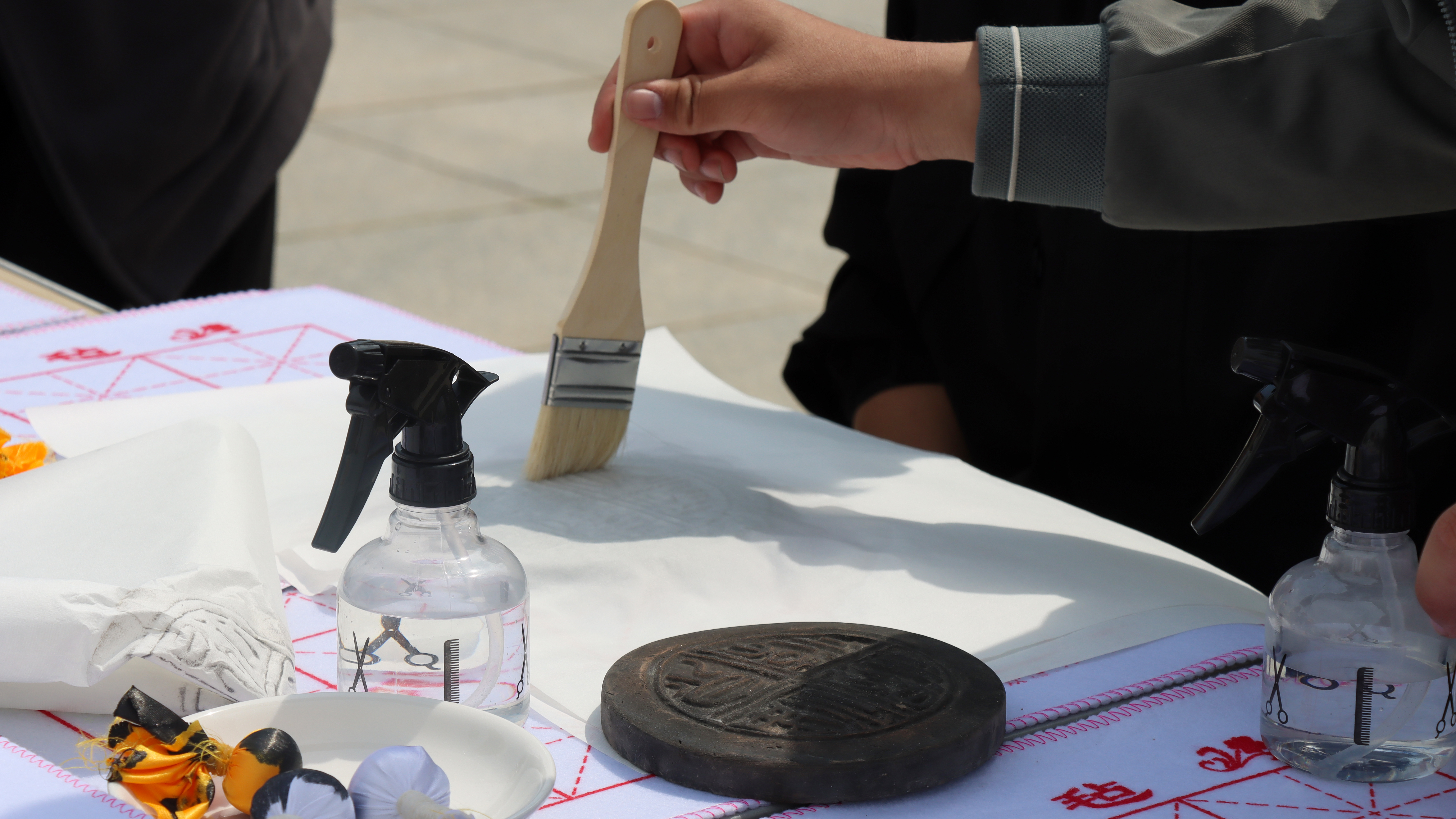 循着拓包不绝于耳的“啪啪”声,我们来到了拓印瓦当的小剧场。古人持刀刻金石,今人执拓摹岁月,通过这项“知者叹其能,观者叹其技,赏者叹其神”的技术,瓦面的规格、纹饰以重温的方式再次感荷其文化内涵与美学意蕴。一方拓片,数个篆字,承载的是一段厚重的历史。同学们俨然化身文脉传承的守护者,神色凝重,屏息凝神,力图还原“屋檐守护神”的任何细节,其间体验“字图正”“黑白反”的奇妙错位。触碰这项起源甚古的工艺,就是透过这种古代的复印机和照相机,更觉古人的智慧。