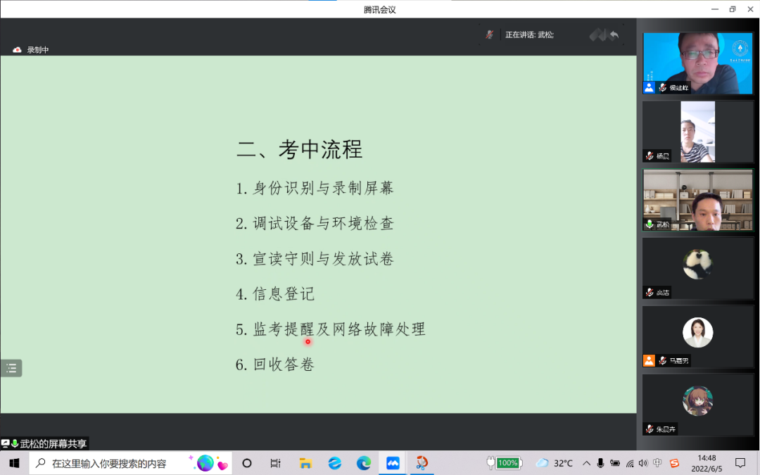 副院长段天璟老师作了总结发言。段老师指出,由于疫情突发,今年春季学期师生们只能在“云”端见面交流,经受住了很多挑战和考验。临近期末,学院对考务工作进行了详细策划和部署,同学们也要尽量克服线上考试的诸多不确定因素,保持积极的学习劲头,传承吉大考古“严谨认真、艰苦奋斗、实事求是、活跃思想”的良好学风,相信这个学期独特的学习和考核过程将成为同学们求学过程中的一笔宝贵财富,同时祝福大家都取得满意的成绩。会议最后,段天璟老师和武松老师针对同学们提出的考试设备等技术问题做出了回答。侯建峰老师最后强调,同学们要严格遵守考试纪律,如果在演练过程中发现问题,要及时与监考老师沟通以尽早解决问题。