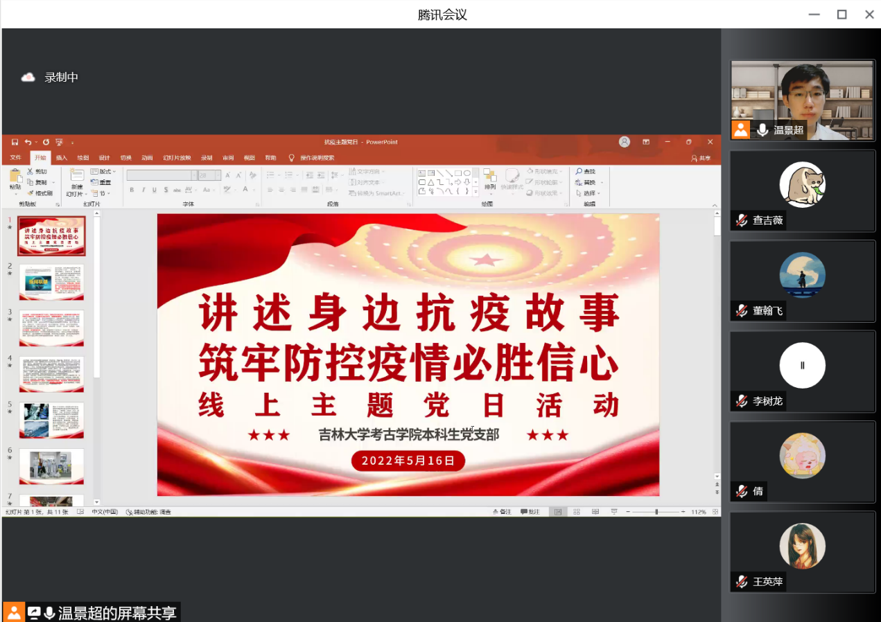 团委副书记、2019级考古班团支书温景超主持,支部全体党员参加了此次会议。会议围绕两个主要内容进行——学习5月5日中共中央政治局常委会会议精神,分享身边的抗疫故事与心得体会。