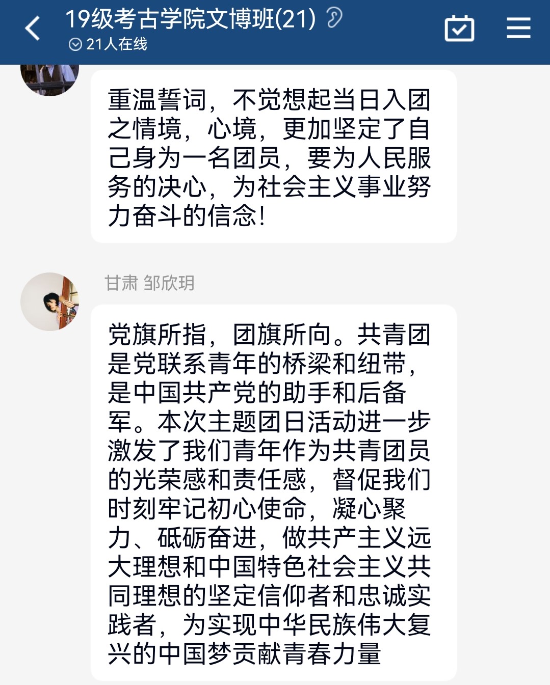 宣誓后,全体团员开启了线上讨论,畅所欲言。团员们表示,百年之前,以进步思想为武装的青年奋起斗争,接受马克思主义的指导,开启新民主主义革命的新征程。百年之后,当代青年应当在党的领导下,传承五四精神的薪火,建设青春之祖国,为祖国和民族的复兴梦想不懈奋斗,不负党和人民的殷切期望。下午五时许,各支部主题活动圆满结束。