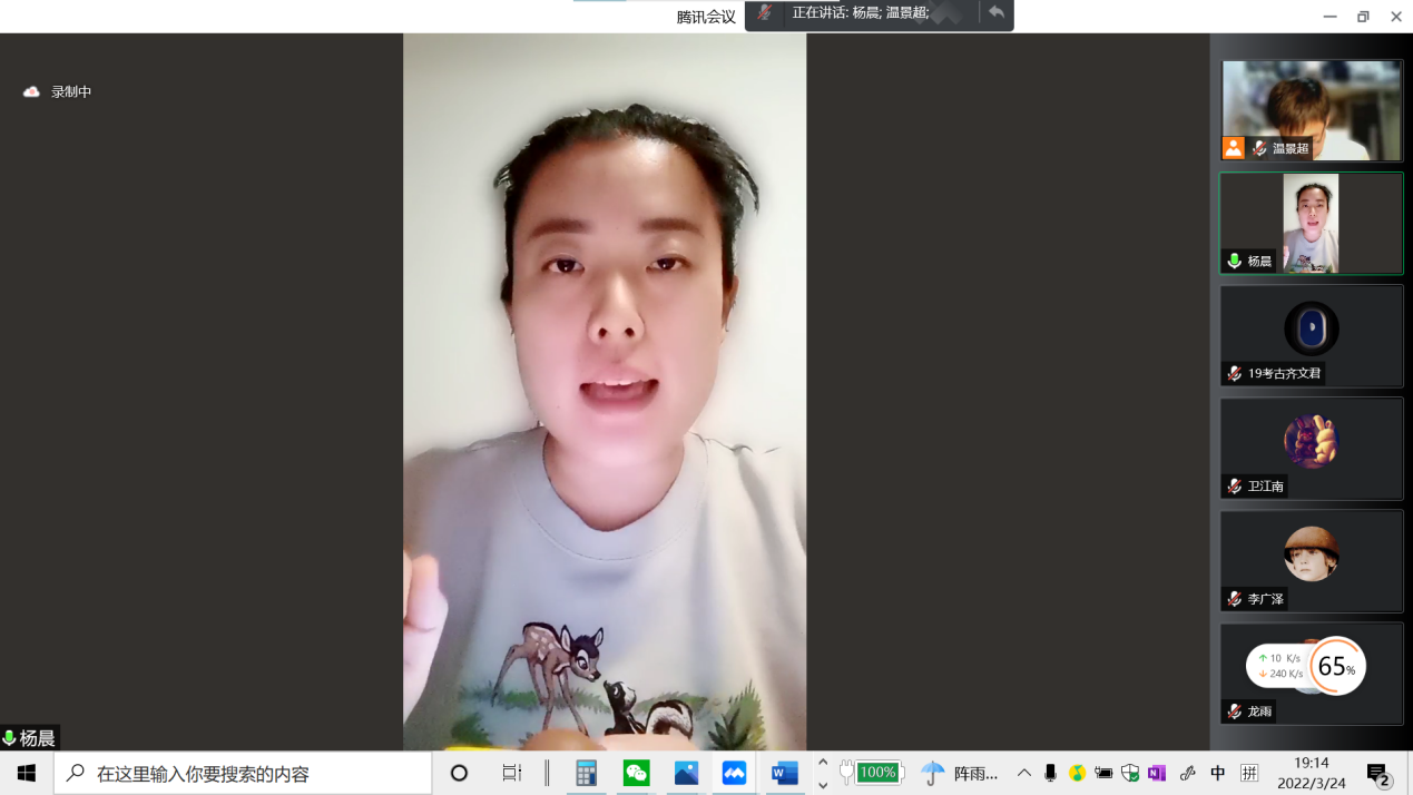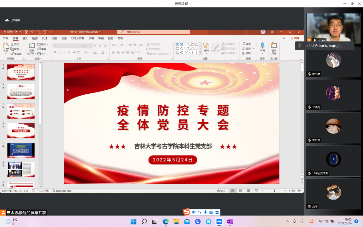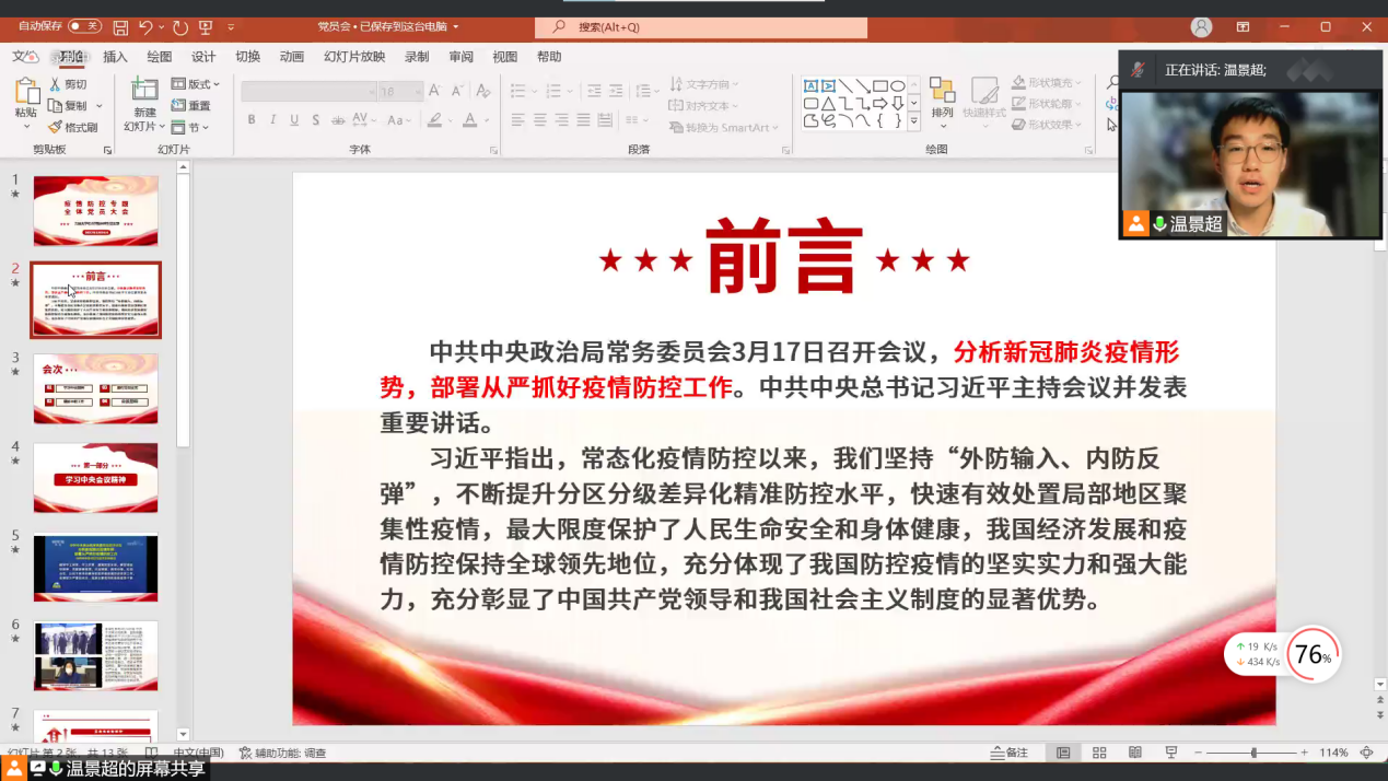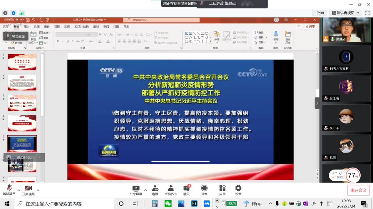 会议第一项温景超同学带领大家学习习近平总书记在3月17日召开的中共中央政治局常务委员会上的重要讲话,介绍了孙春兰副总理在吉林省调研时作出的疫情防控工作部署和要求,重点解读了常态化疫情防控的相关政策:中国始终要坚持内防反弹,外防输入的大的策略,始终保持动态清零。