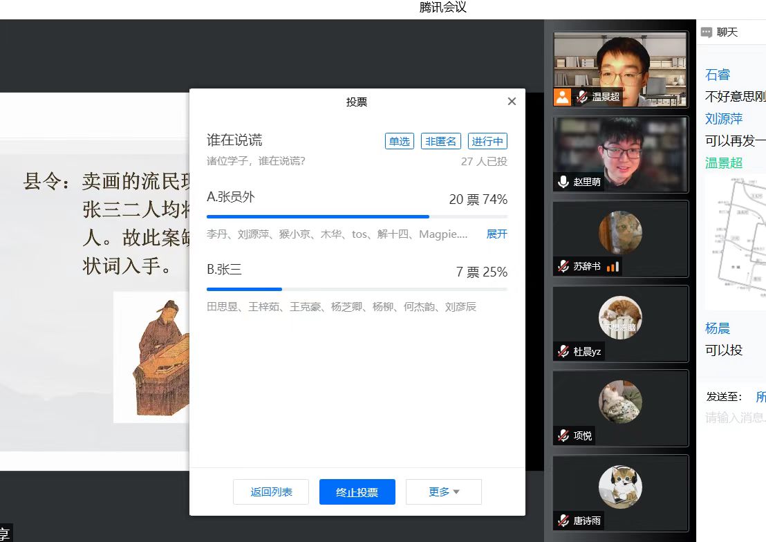 赵里萌老师从自己的学术论文《清明上河图》地理位置新探中的研究论点出发,穿越千年,与大家一起搜集线索、抽丝剥茧,寻找《清明上河图》中的彩蛋,在北宋东京城里开展了一场烧脑的“推理探案”。活动伊始,赵老师以幽默诙谐的语言和幻灯片营造出了欢快热烈的课堂氛围。活动正式开始后,同学们紧跟老师思路,抓住机会踊跃发言,积极与老师互动,并参与投票与答题。其间,赵老师不时穿插精彩讲解,逐一为我们揭示了历史名画中隐藏的秘密。活动过程中,各环节的问答热火朝天,学术氛围浓厚,同学们兴致勃勃,获得了极强的参与感。
