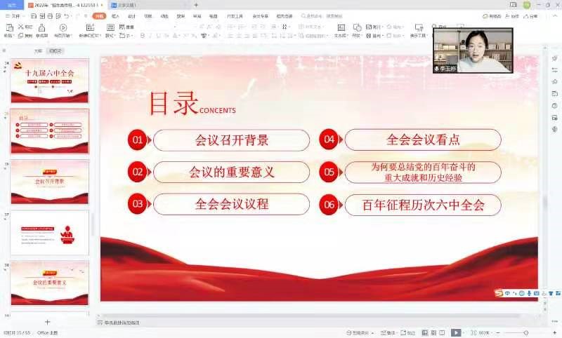 宣讲活动开始前,李玉婷所在的实践活动小组,召开了多次小组会进行了充分的讨论,确立了宣讲主题和内容安排。随后的时间,大家认真搜集相关资料,了解相关内容,作了详尽的准备。宣讲会面向高中学生,采取腾讯会议的形式开展了线上宣讲。小组成员按照内容分工依次介绍了十九届六中全会会议的召开背景、会议看点、重要意义,百年来党带领人民取得的重大成就和历史经验及百年征程中历次的六中全会。在主旨报告结束后,小组成员与听众进行了互动交流,围绕党的奋斗历史进行了开放式交流。大家都充分认识到摆在我们面前最重要的政治任务,就是认真学习贯彻党的十九届六中全会精神,进一步统一思想、统一意志、统一行动,自己应当立足本业,努力学习知识,以待将来奉献社会。