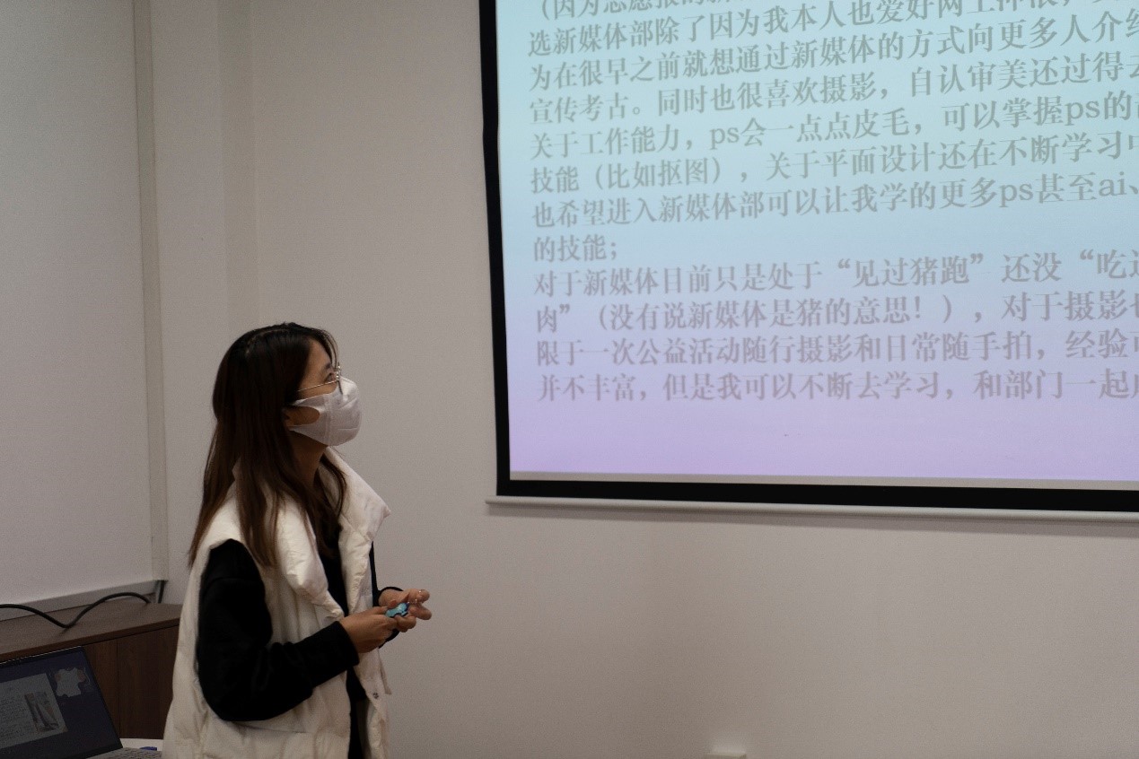 为保障纳新活动的高效进行,在面试开始前,全体团学组织负责人统筹协调,商讨了各部门的面试问题与选拔标准,对担任面试官的相关负责人进行了培训,并确定了以线上线下相结合的方式开展面试活动。参与面试的同学共被分为四组,在签到登记后,依次进入工会活动室开始面试。本次面试分为自我陈述与现场答辩两个环节,由面试官分别进行打分评级。在自我陈述环节,每一位同学都做了充分的准备,通过PPT、才艺表演等多种形式,阐述了对团学组织与应聘职位的认识和工作设想,表达了为学生与学院服务的决心与担当精神,充分展现出新时代青年大学生锐意进取、敢于争先的良好精神风貌。随后,面试官依据各位同学的自我陈述,结合各部门的具体工作要求,从实践能力、交往能力和个人优势等方面进行考察,提出了相应的问题。应试同学灵活答辩,展示了良好的面试风采。回顾整个面试过程,氛围活泼而又不失严肃,形式灵活而又不失严谨,同学们组织有序,各环节衔接流畅,取得了良好的面试效果。随着最后一位同学完成线上面试,下午4时50分,本次换届纳新面试圆满结束。