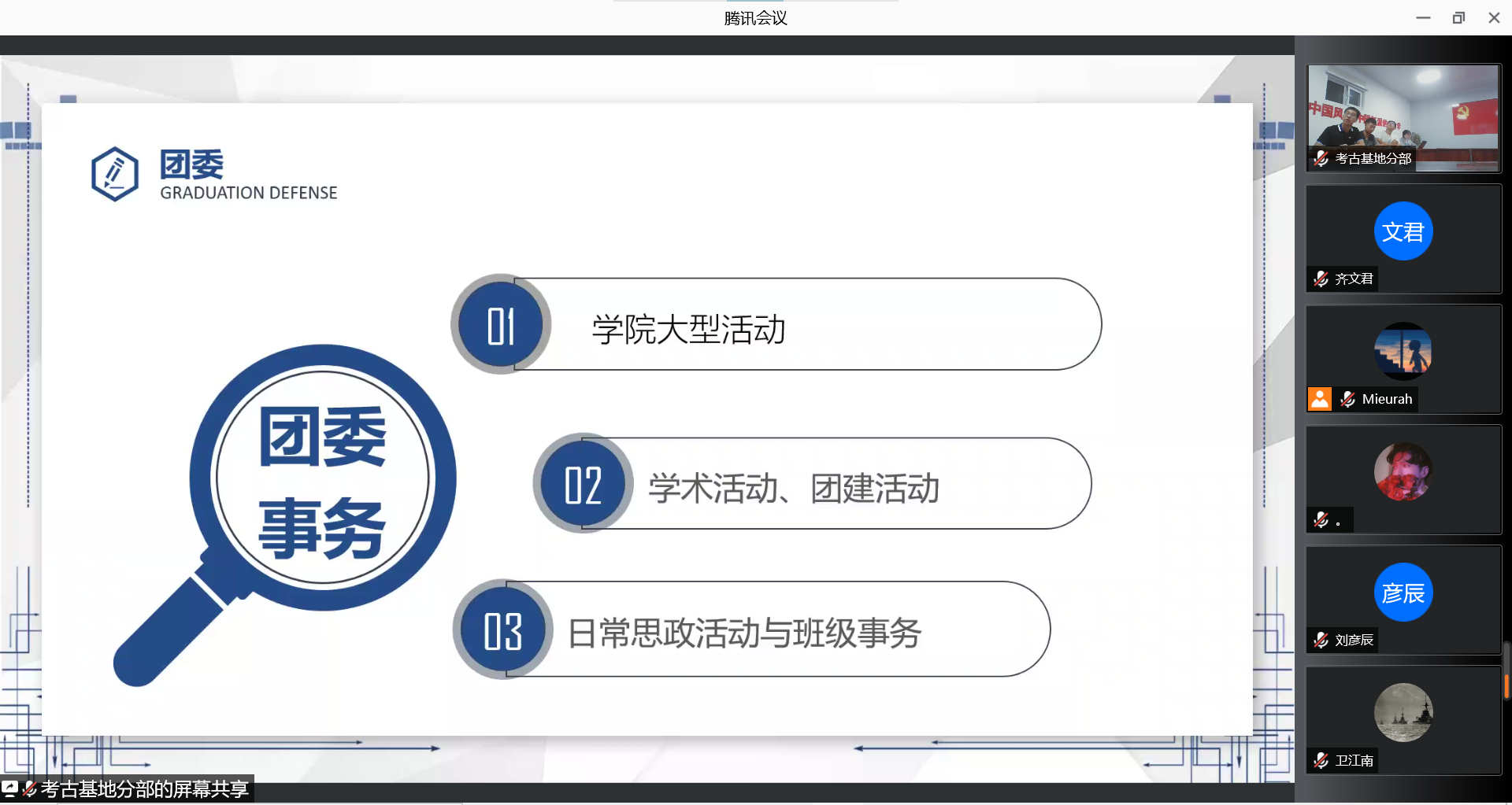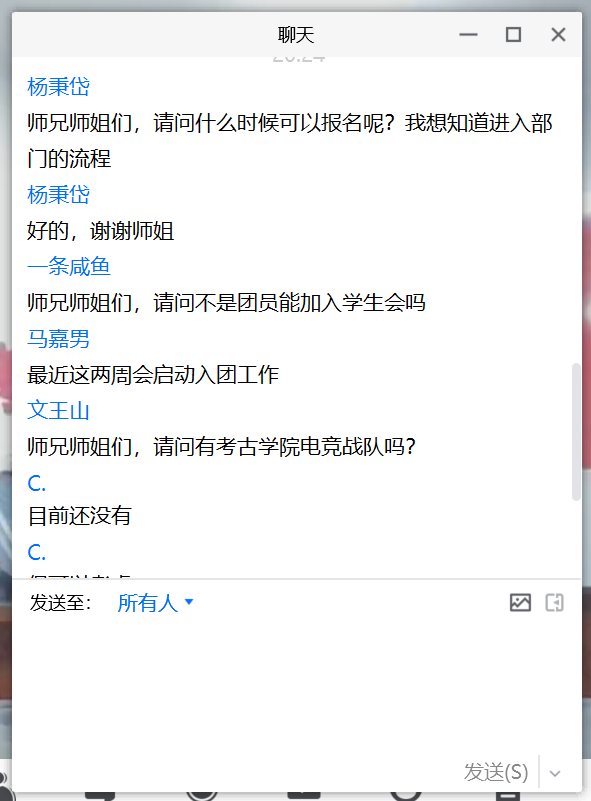 团学组织有了较为充分的认识。在全体部门的宣讲结束之后,自由提问与答疑环节将本次宣讲会的热烈气氛推向新的高潮。最后,主持人张馨予同学向新生同学们宣布了正式纳新面试的相关信息。晚上8点30分,在庆祝国庆节到来,祝福祖国繁荣昌盛的欢呼声中,本次团学组织线上宣讲会议圆满结束!