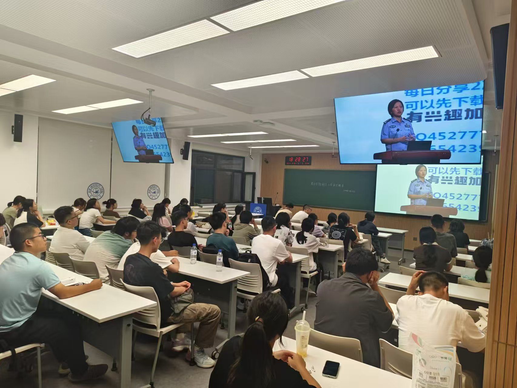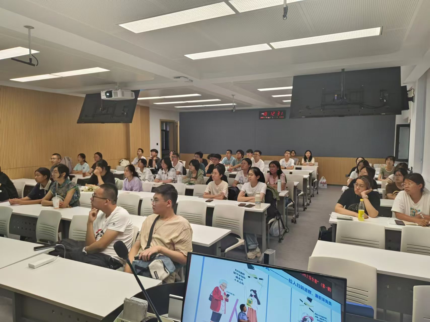 齐夏警官的讲解细致入微、内容全面;现场气氛活跃,新生们全神贯注地聆听着每一个知识点,不时拿出手机记录下关键内容。讲座结束后,同学们纷纷表示,这次“万人同上安全课”活动不仅让他们学到了许多实用的安全知识和防诈技巧,也将对他们今后的学习生活产生积极深远的影响。