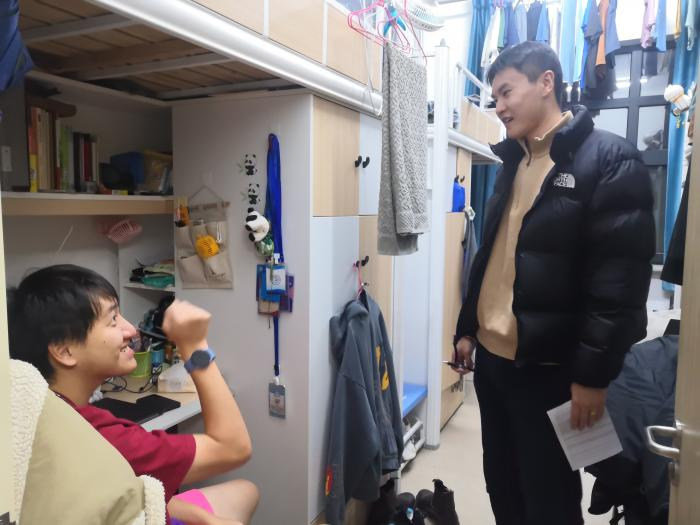 于2024年11月27日17:00开展研究生公寓卫生安全检查工作,研究生辅导员依德日贡老师走访学院研究生寝室,检查宿舍内务卫生及安全隐患。
