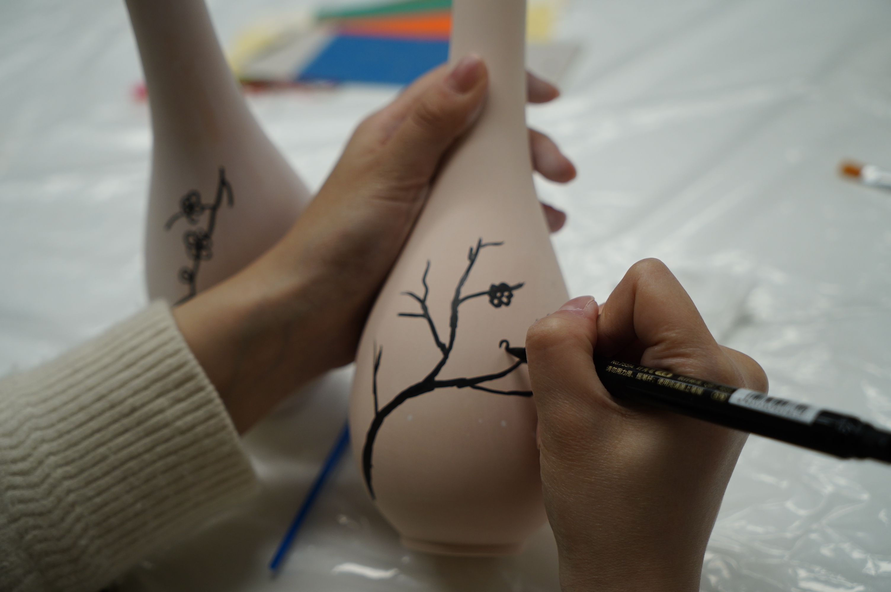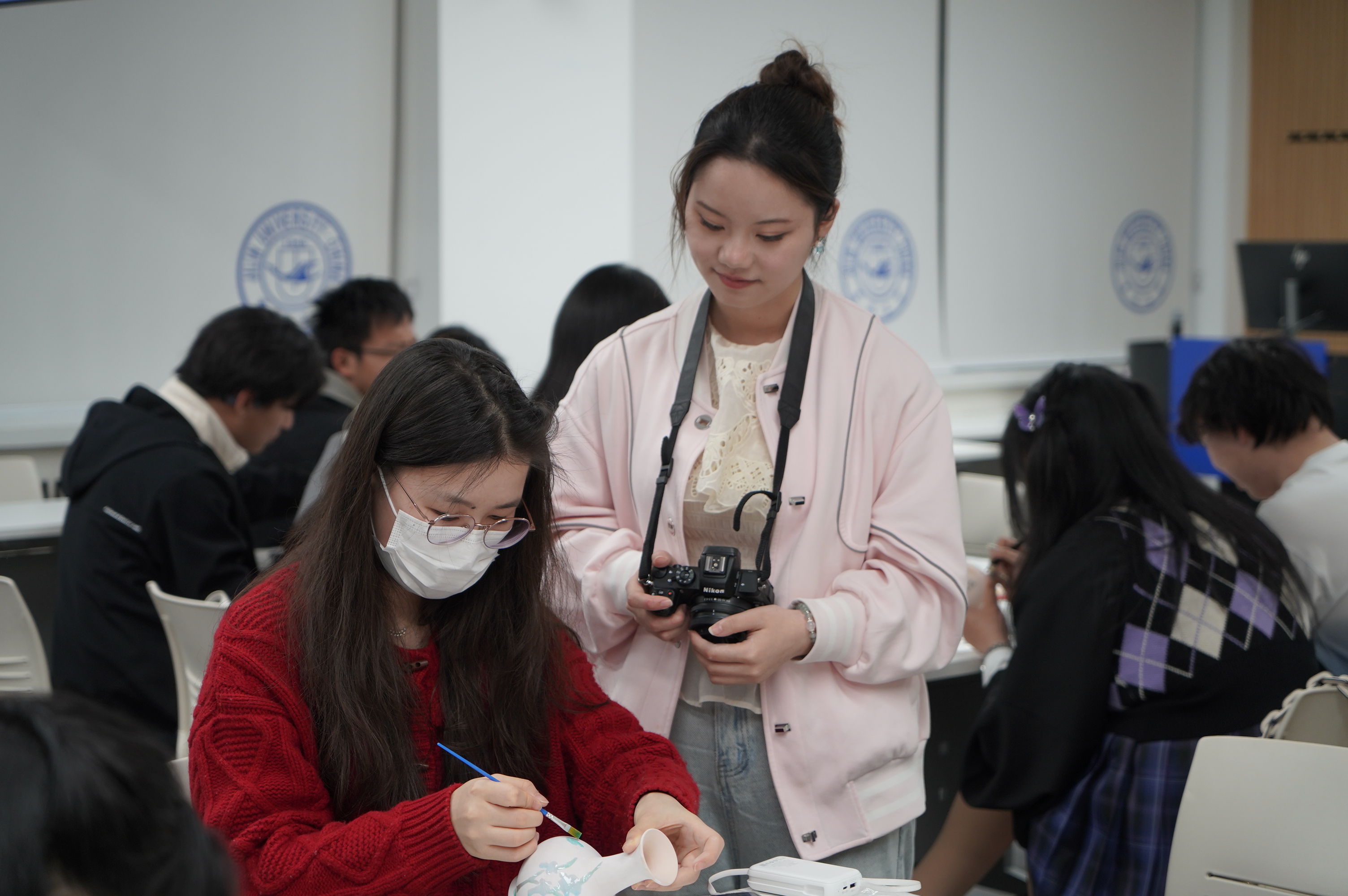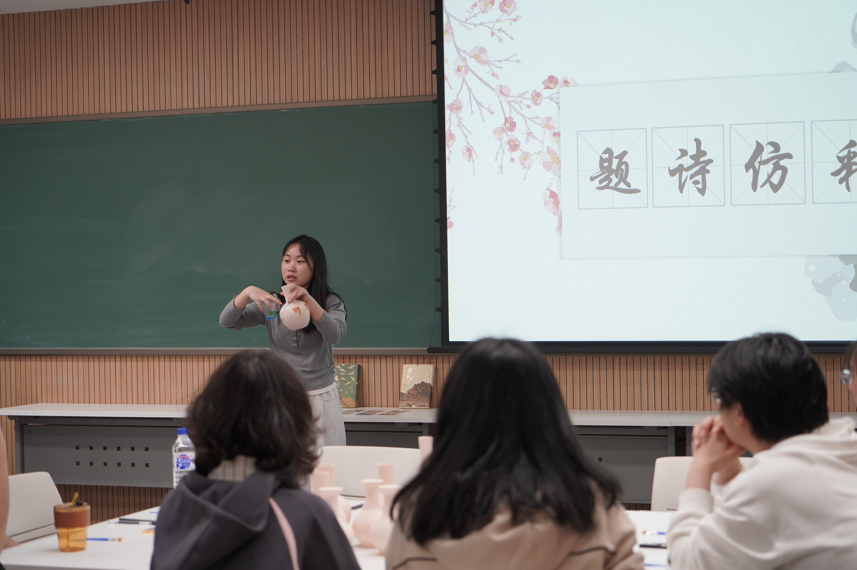 文保协会学术部负责人董欣悦首先讲解了瓷器题诗的历史渊源,介绍了仿釉工艺的材料特性与制作流程。在随后的实践环节中,活动志愿者穿梭于各制作台前,为参与者提供技术指导。同学们执笔于素胚之上,在釉色与墨香交融的手作过程中,切身感受到传统技艺承载的文化厚度。