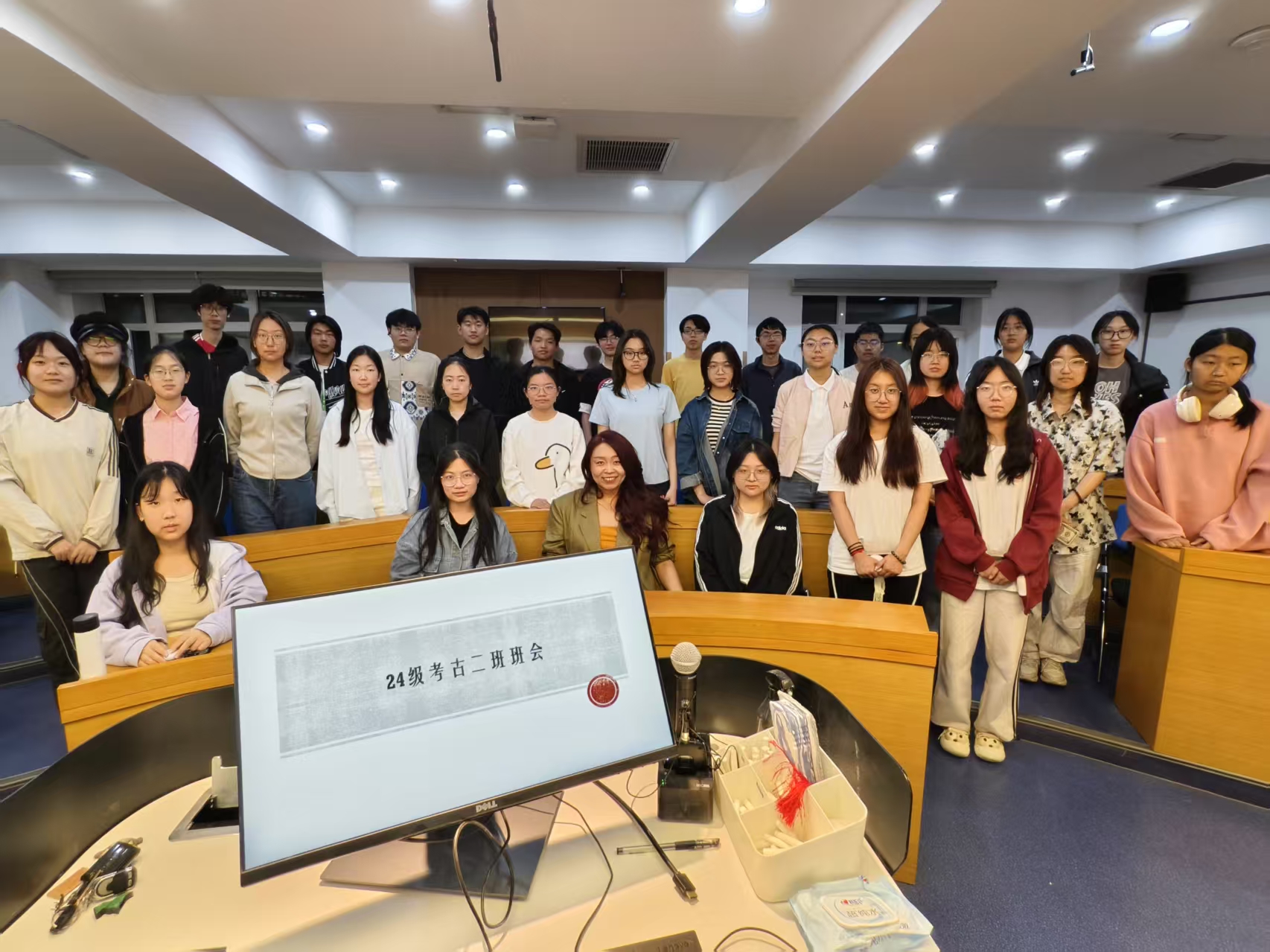 2024级考古2班于逸夫教学楼202室开展文物保护科普主题班会,班主任冯楠老师、辅导员马嘉男老师和考古2班全体同学参加,会议由班长孙凤涓主持。