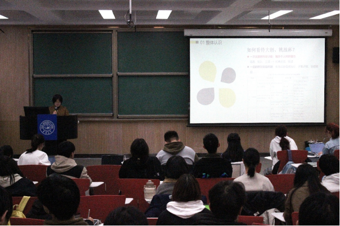 何烨则聚焦于自身参与过的挑战杯竞赛与大创两大科研竞赛项目,就二者间的实质差别与参与条件做了详细说明。她按照选题、团队、答辩、成果四环节依次介绍了大创与挑战杯的同与异,将现身说法渗透入团队处理与合作关系等科研中的各方面,触类旁通且内容充实。