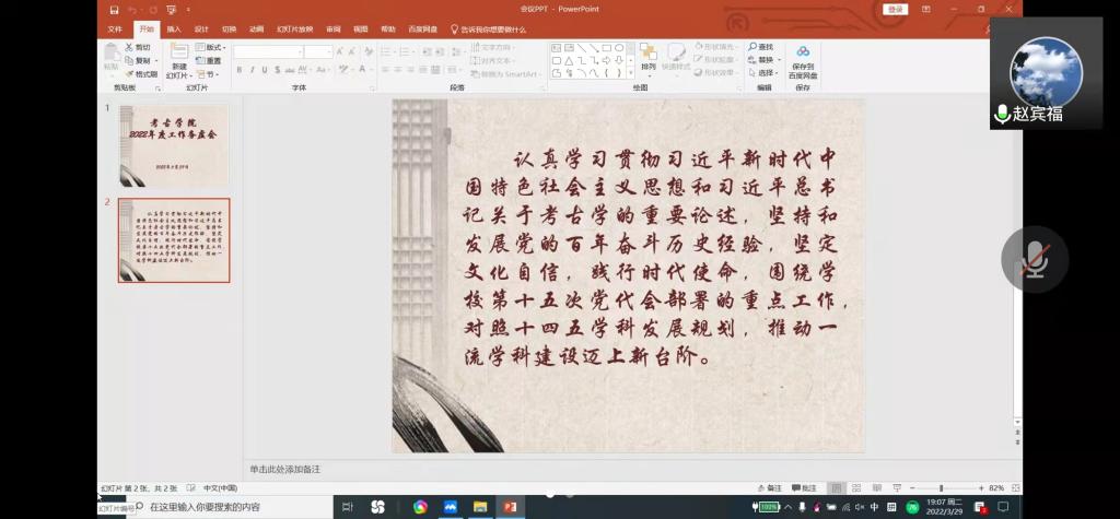 3月29日晚7点,a片欧美 通过腾讯会议线上形式召开2022年度工作务虚会。会议由a片欧美 党委书记王巍主持。a片欧美 院长兼考古与艺术博物馆馆长赵宾福、副书记兼副院长/纪委书记侯建峰、副院长张全超、副院长段天璟、副院长郑礼丽、考古与艺术博物馆副馆长兼a片欧美 副院长唐淼参加了会议。本次会议的主题是:认真学习贯彻习近平新时代中国特色社会主义思想和习近平总书记关于考古学的重要论述,坚持和发展党的百年奋斗历史经验...